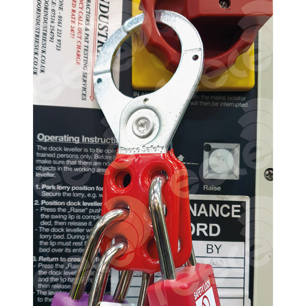 Lockout Hasp steel, red plastic coated, scissor action 38mm dia jaws