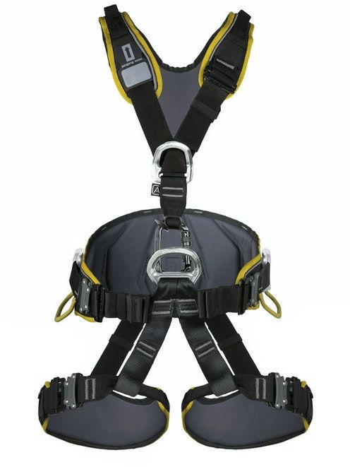 Fully adjustable harness for rope access with a padded wide waist belt, leg loops, and shoulder straps. Suitable also for work positioning, fall arrest, and work restraint situations.